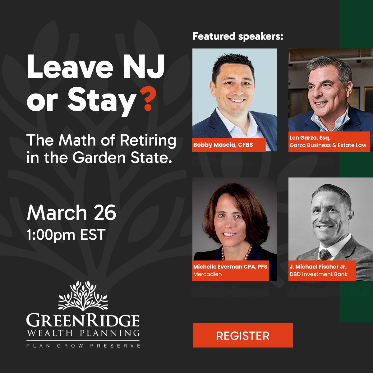 Join us for “Leave NJ or Stay? The Math of Retiring in the Garden State,” a panel discussion that examines the financial implications behind both paths.